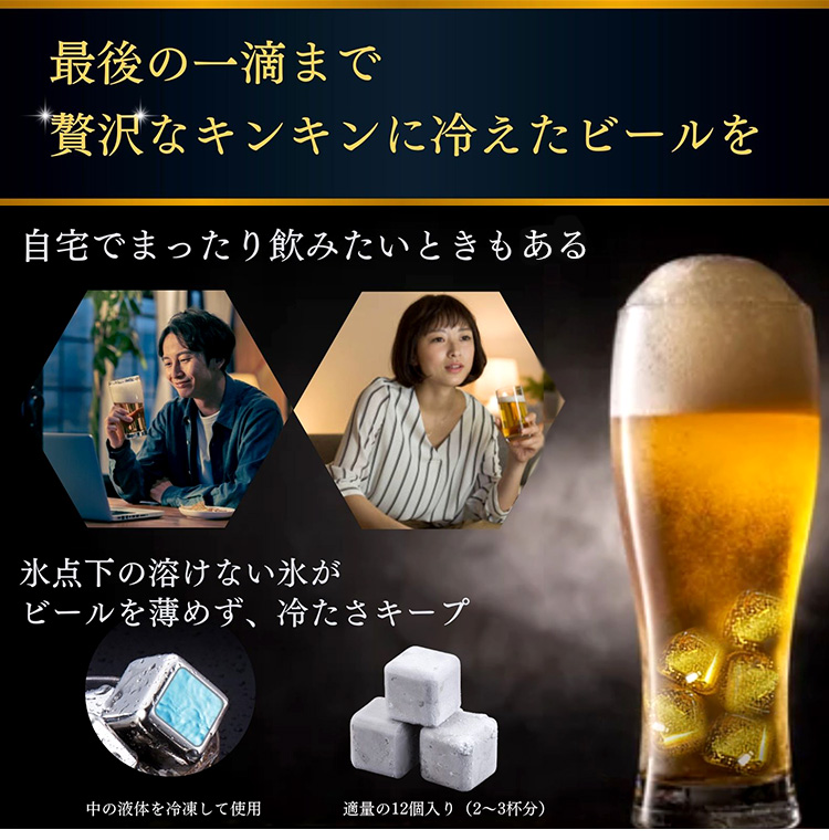 | 永久に溶けないステンレス氷だから味が薄まらない・冷たさ長持ち ゆっくり飲んでもビールを薄めず、飲み終わりまで冷たさをキープ。自宅でビールを飲む至福の時間に。 |