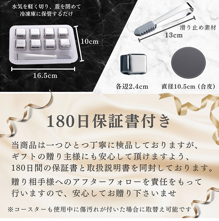 | 材質 | 【ビアキューブ】SUS304ステンレス 【キューブ内容液】純水、食品用グリセロール 【コースター】合皮(ステッチ加工) |