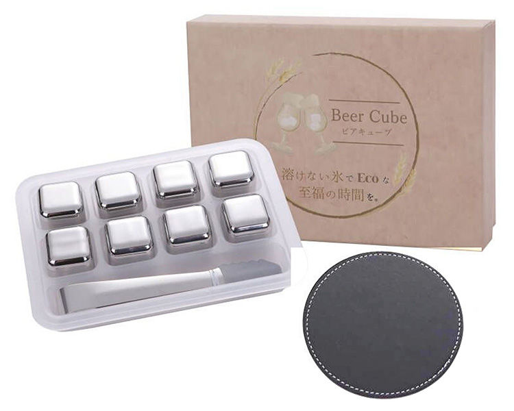 | セット内容 | ビアキューブ×8個、トング×1、ビアキューブ専用ケース×1、合皮製コースター×1枚 |