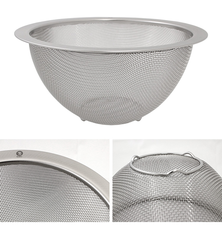 | 一般的なザルと比べて太い線径0.57mmのワイヤーを採用することで圧倒的な強度を実現。 破れにくく型くずれしにくいプロ仕様だから、毎日ハードに使用しても末永くご利用いただけるアイテムです。 ボウルとメッシュボウルの高さには差があり、重ね合わせると隙間ができます。 これにより重ね合わせた状態でも指を差し込んでサッと持ち上げやすいのです。 さらにこの高低差のおかげで、水に浮きやすい食材を流水にさらしても、水と一緒に流れ出ないのです。 この煩わしさからの解放は、普段料理をされる方ならきっと気に入っていただけるはず。 パンチングのザル(穴が開けられたタイプ)との大きな違いは、やはり水キレの良さ。 お米のような細かなものでもしっかりと受け止め、気持ちよく水を切ってくれます。 |