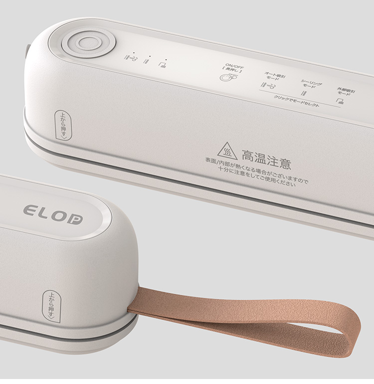 | Susealはボタンが一つあるだけのスマートデザイン! スイッチの長押しで基本の「オート吸引モード」を起動する事ができます。 基本のオート吸引モードは、「袋を差し込み」「本体で強く挟む」だけで、袋の中の空気を吸引し、封のシール閉じまで自動で行います。 さらに吸引力は60kPaと強力なので、小さい袋であれば数秒で真空にすることができます。 |