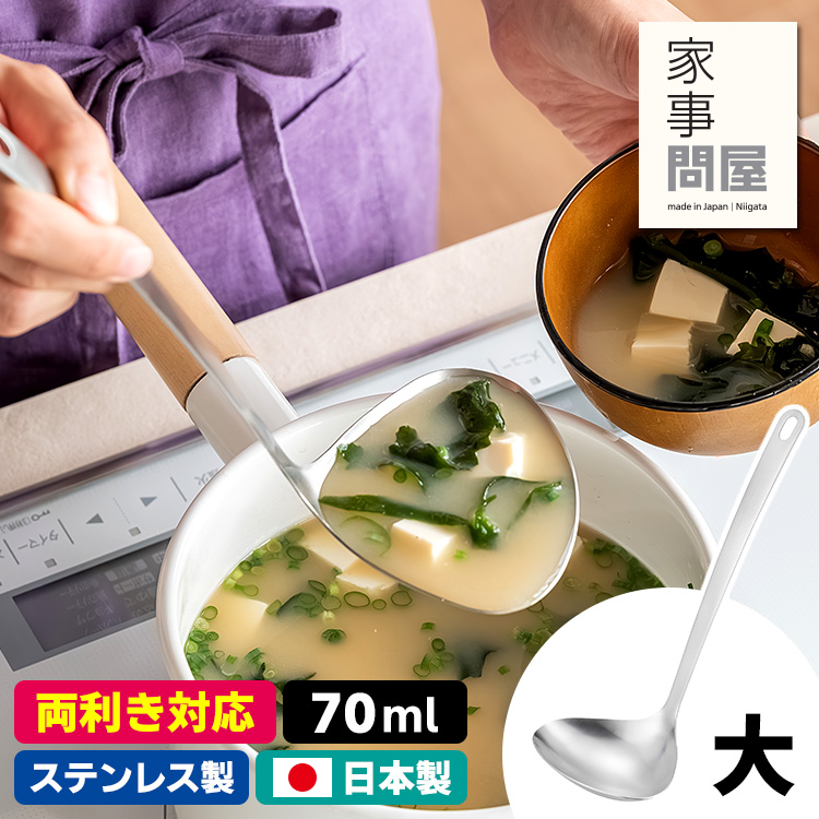 | 鍋底や鍋肌にあうハマグリ型で具材を寄せ集めやすいです。 調理中はもちろん卓上でも取り回ししやすい短めハンドル。 左右対称の注ぎ部で口の小さい容器などにも移し替えやすいです。 容量は70mlで、みそ汁なら2〜3回ですくえる大きさです。 ハンドルに穴が開いているので、フックなどに掛けて収納していただけます。 ● 鍋肌や鍋底にフィットしやすいハマグリ型 皿部分の手前側が鍋の側面や底面にフィットするので、寄せてかき集めやすいです。 ● 従来品と比べて短く軽いハンドル ハンドルが短い事で、調理中の鍋や卓上での取り回しがしやすいです。 ● 右利き左利きどちらでも注ぎやすい 左右対称の注ぎ部で、小さい径の容器でも注ぎやすいです。 |