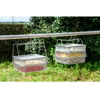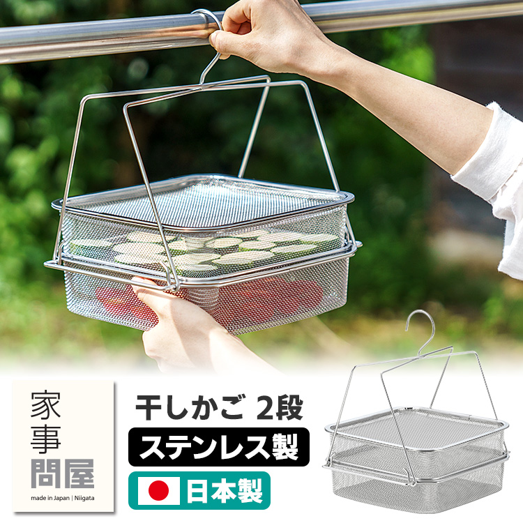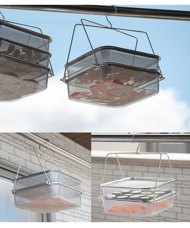 | 野菜や果物などの干し物づくりに。 干した食材は旨味が凝縮されて、濃厚な味わいになります。 乾燥させることで調理の際には味がよく染み、調理時間の短縮になります。 栄養価も高まり、しっかり乾燥させれば保存も利きます。 残り野菜をまとめて入れて、手軽に日常使いできます。 ● 収まりの良い四角いザル ザル1枚は輪切りのバナナ1本分が入るサイズ。 26cmくらいまでのアジの開きも入ります。四角い形状で無駄なく食材を並べられます。 ● ザルをカスタマイズできます 食材の量に合わせて使用するザルの枚数を加減できます。 最大4枚まで重ねて吊るせます。 ※かごを追加する場合は別売のかごをご使用ください。 |
