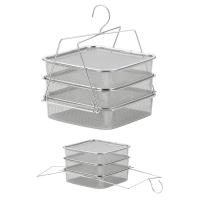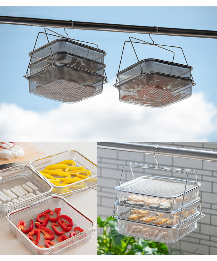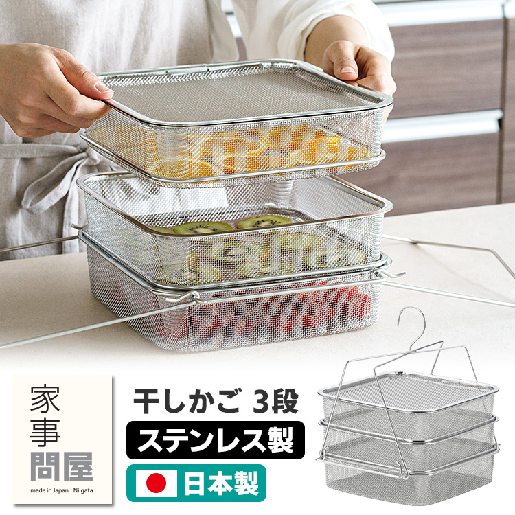 | 野菜や果物などの干し物づくりに。 干した食材は旨味が凝縮されて、濃厚な味わいになります。 乾燥させることで調理の際には味がよく染み、調理時間の短縮になります。 栄養価も高まり、しっかり乾燥させれば保存も利きます。 残り野菜をまとめて入れて、手軽に日常使いできます。 ● 収まりの良い四角いザル ザル1枚は輪切りのバナナ1本分が入るサイズ。 26cmくらいまでのアジの開きも入ります。四角い形状で無駄なく食材を並べられます。 ● ザルをカスタマイズできます 食材の量に合わせて使用するザルの枚数を加減できます。 最大4枚まで重ねて吊るせます。 ※かごを追加する場合は別売のかごをご使用ください。 |
