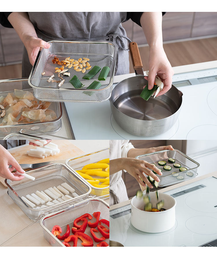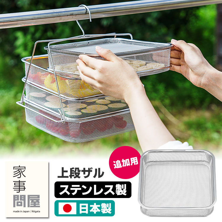 | 干しかご用の上段ザル(部品)です。 最大4枚まで重ねて吊るせます。 ※こちらは追加用のザルです。本体は商品に含まれません。 野菜や果物などの干し物づくりに。 干した食材は旨味が凝縮されて、濃厚な味わいになります。 乾燥させることで調理の際には味がよく染み、調理時間の短縮になります。 栄養価も高まり、しっかり乾燥させれば保存も利きます。 残り野菜をまとめて入れて、手軽に日常使いできます。 |