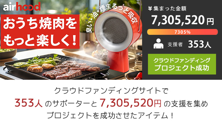 | Airhoodで気になる部屋の臭いやキッチンのベトベトとはさようなら! ワイヤレスだから場所を選ばずに使えてどこでも楽しく焼肉やホームパーティ! 3段階の吸引スピードと2種類のフィルターで臭いも油も煙もスッキリ。 使用する際は3段階の吸引レベル調整が可能です。 動作音も小さく、レベル1〜レベル3で57dbA〜69dbA程度です。 |
