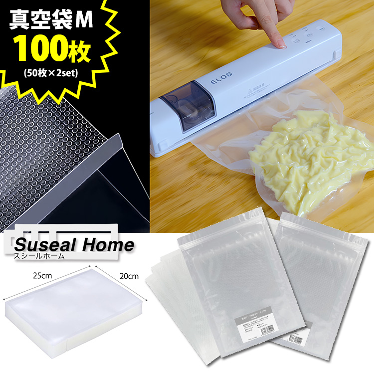 | 【正規販売店】真空パック機「Suseal Home」用の真空袋、Mサイズの100枚セットです。Susealに同梱されている真空パック用の袋をもっと使いたい方におすすめです。 |