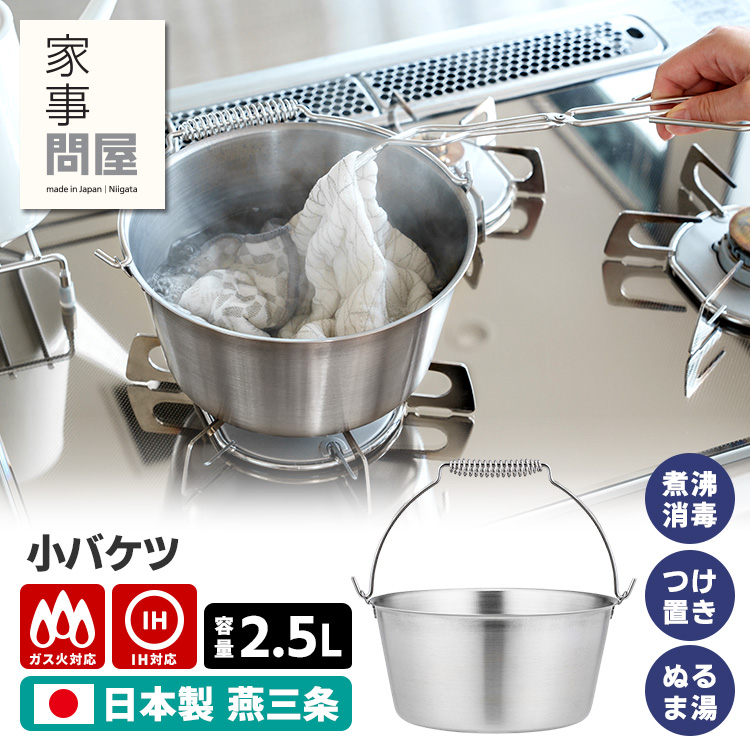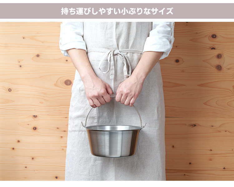 | 小ぶりなサイズで持ち運びがしやすく、家のあちこちを掃除するときに便利。 一枚板を加工して作っているので水漏れしません。 直火・IHにかけられるので、つけ置き用のぬるま湯を作ったり、煮沸消毒をしたりできます。 1L・2Lの目安目盛り付き。 |