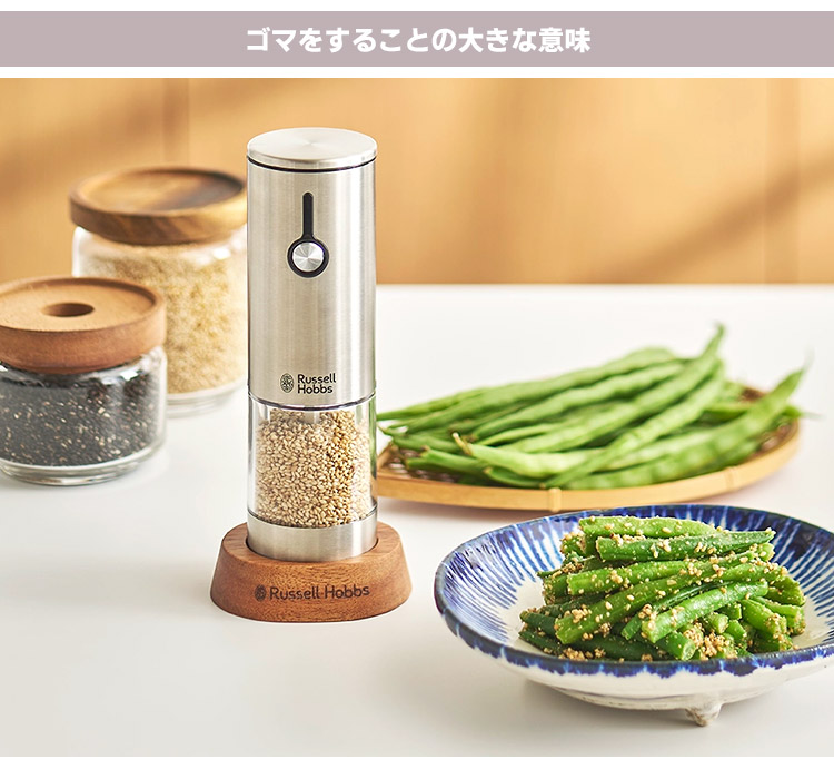 | すりたてのゴマは風味がよく、ゴマの旨味も感じやすくなるので食が進みます。 一方、ゴマはすった時点からの酸化によって、味も栄養価も速いスピードで落ちていきます。 ラッセルホブスのゴマミルを食卓に常備しておけば食べる直前にすることができるので、 ゴマの香りと、高い栄養素をしっかり味わいながら食事を楽しむことができます。 |