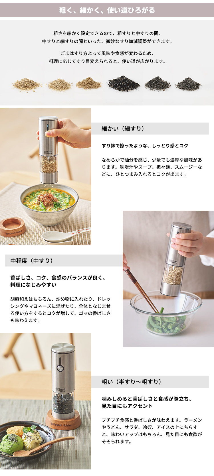 | 粗さを細かく設定できるので、粗すりと中すりの間、中すりと細すりの間といった、微妙なすり加減調整ができます。 ごまはすり方よって風味や食感が変わるため、料理に応じてすり目変えられると、使い道が広がります。 ● 細かい(細すり) “すり鉢で擦ったような、しっとり感とコク” なめらかで油分を感じ、少量でも濃厚な風味があります。味噌汁やスープ、担々麺、スムージーなどに、ひとつまみ入れるとコクが出ます。 ● 中程度(中すり) “香ばしさ、コク、食感のバランスが良く、料理になじみやすい” 胡麻和えはもちろん、炒め物に入れたり、ドレッシングやマヨネーズに混ぜたり、全体となじませる使い方をするとコクが増して、ゴマの香ばしさも味わえます。 ● 粗い(半すり〜粗すり) “噛みしめると香ばしさと食感が際立ち、見た目にもアクセント” プチプチ食感と香ばしさが味わえます。ラーメンやうどん、サラダ、冷奴、アイスの上にちらすと、味わいアップはもちろん、見た目にも食欲がそそられます。 |