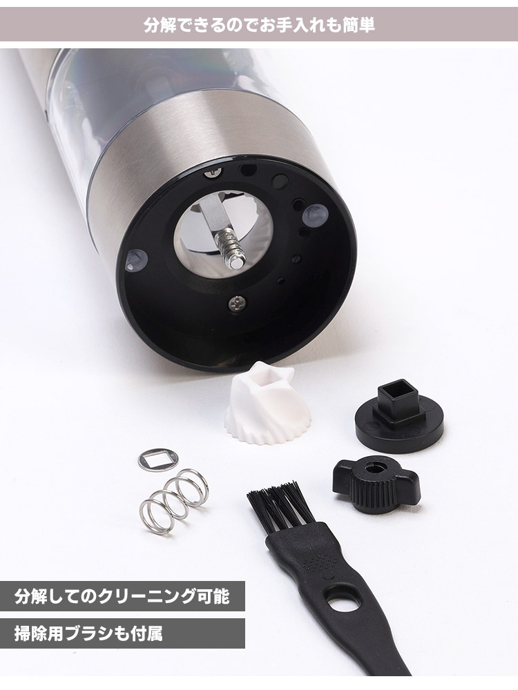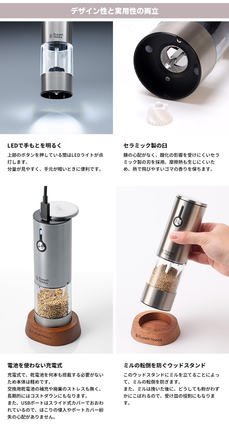 | ● LEDで手もとを明るく 上部のボタンを押している間はLEDライトが点灯。分量が見やすく、手元が暗いときに便利です。 ● セラミック製の臼 錆の心配がなく、酸化の影響を受けにくいセラミック製の刃を採用。 摩擦熱も生じにくいため、熱で飛びやすいゴマの香りを保ちます。 ● 電池を使わない充電式 充電式で、乾電池を何本も搭載する必要がないため本体は軽めです。 交換用乾電池の補充や廃棄のストレスも無く、長期的にはコストダウンにもなります。 また、USBポートはスライド式カバーでおおわれているので、ほこりの侵入やポートカバー紛失の心配がありません。 ● ミルの転倒を防ぐウッドスタンド このウッドスタンドにミルを立てることによって、ミルの転倒を防ぎます。 また、ミルは挽いた後に、どうしても粉がわずかにこぼれるので、受け皿の役割にもなります。 |
