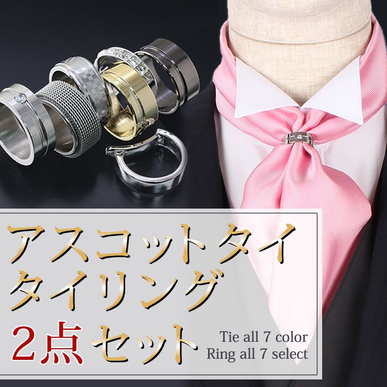 組み合わせは自由 お好きなカラーのアスコットタイとタイリング2点セット メンズ 紳士用 男性用 フォーマル ビジネス カジュアル ブランド おしゃれ パーティー 冠婚葬祭 ドレスシーン 結婚式 二次会 無地 赤 青 紫 紺 ネイビー シルバー 銀 ゴールド 金 セット ネクタイ