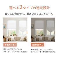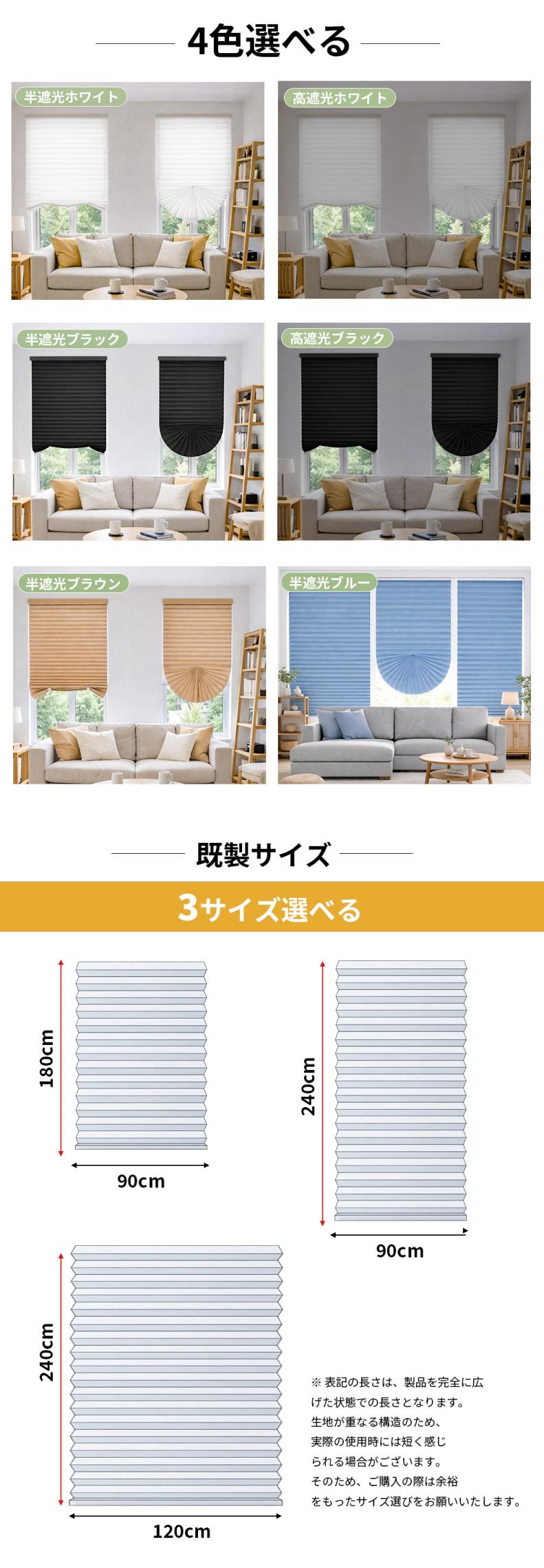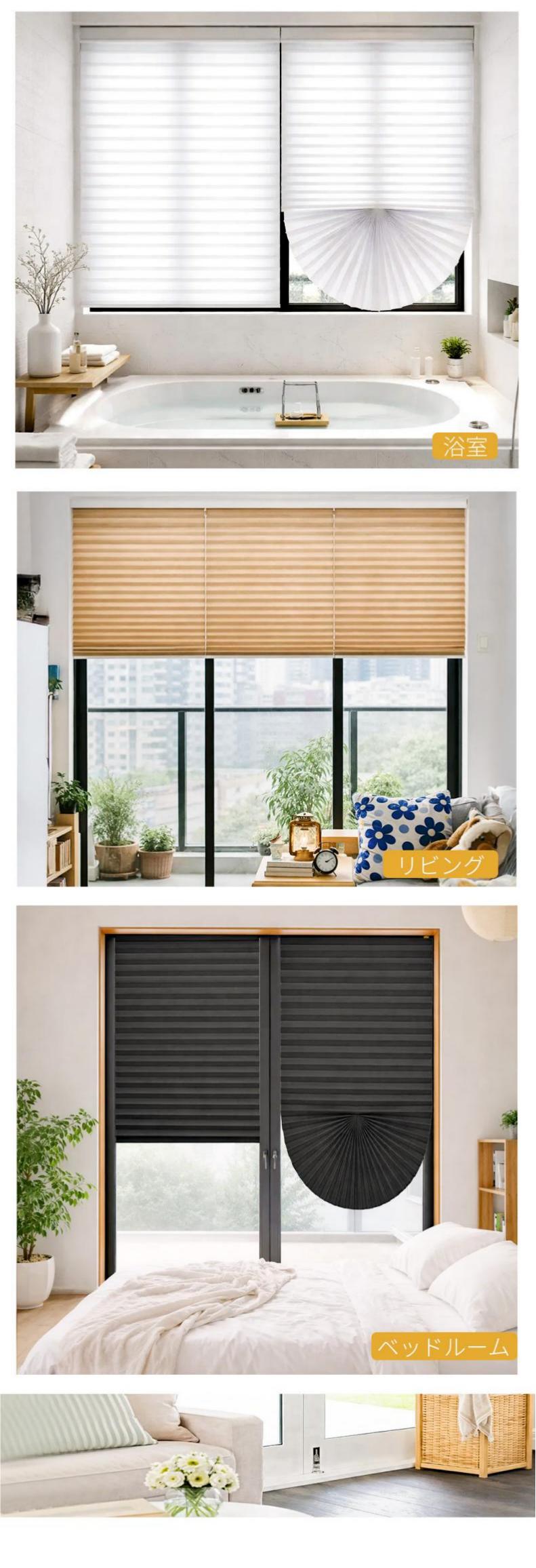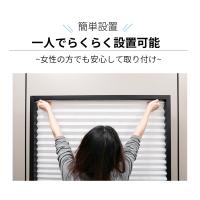 | 商品について | 本商品はプリーツブラインドです。 粘着式でネジや工具を使わず、貼るだけで簡単に設置できます。 サイズはハサミで自由にカットでき、窓の大きさに合わせて調整可能です。遮光・保温効果があり、操作チェーンや紐を使用しない設計のため、小さなお子様のいるご家庭でも安心してお使いいただけます。 ※貼り付け面の材質や状態によっては、十分に接着しない場合があります。 ※ご使用前に、貼り付け面の汚れ・油分・水分をよく拭き取ってください。 ※パソコン環境などにより、画面上の色と実際の色が異なる場合がございます。 | |
