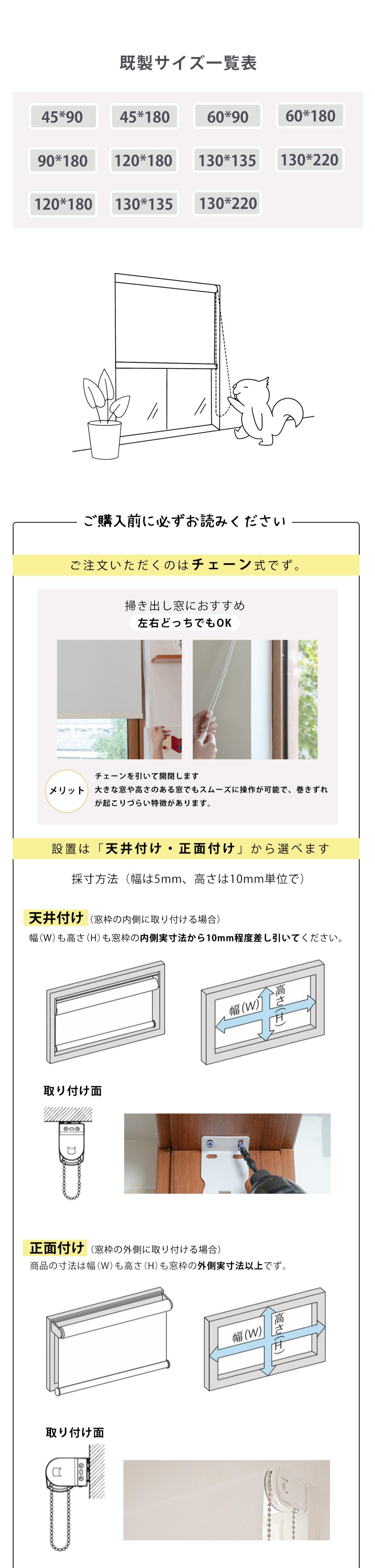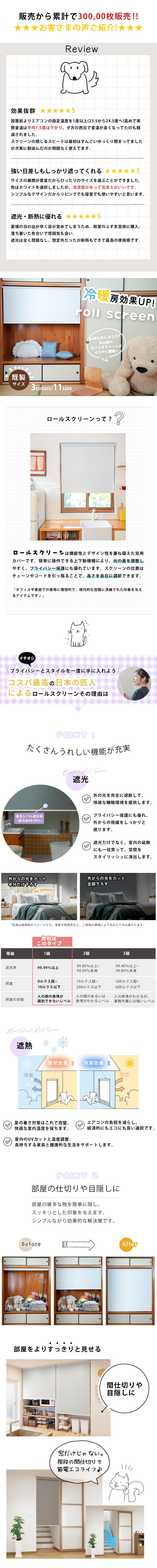 | 商品特徴 | 【快適な使い心地】1級遮光機能より日光をしっかりとシャットアウトしてくれます。UVカット効果もあるため、紫外線による床壁、フローリングや家具の劣化を防げます。また、夏は太陽熱によって室内温度の上昇を抑え、冬は冷気を遮ってくれるので、遮熱保温効果を持ち、季節を問わず快適に過ごせます。冷暖房の効果もアップ するため省エネ効果が期待できます。さらに、シンプルな無地デザインに仕上がり、どんなインテリアにも馴染み、落ち着いた雰囲気を演出してくれます 【使える場所】ロールスクリーンは、家庭やオフィス、店舗などさまざまな場所で使えます。主に窓やドアに取り付けて、光や視線を調節したり、プライバシーを確保したりするのに便利です。また、部屋のインテリアにも馴染みやすく、スッキリとした印象を与えることができます。個人用には子ども部屋、寝室、小窓、リビング階段、キッチン、浴室、台所、脱衣所等。業務用にはオフィス、事務所、ホテル、病院、レストラン、美容室等。 【取り付け方法】天井付け:窓枠内に取り付けます。「 天井付け」は圧迫感がなく、窓際にエアコンや家具を設置することもできます。 【コードレス式ロールスクリー】コードがなく、スクリーンを任意の位置で止めることができ、直接スクリーンを手で操作するだけです。これにより、操作が非常に簡単で、子供や高齢者でも簡単に扱うことができます。 【チェーン式ロールスクリーン】チェーン式のロールスクリーンは、操作が簡単で使いやすいことです。チェーンを引くことでスクリーンを簡単に上げ下げできるため、光やプライバシーを素早く調節することができます。これにより、快適な環境を維持することができます。また、メカニズムがシンプルで頑丈なので、耐久性があり、長期間使用することができます。 | |