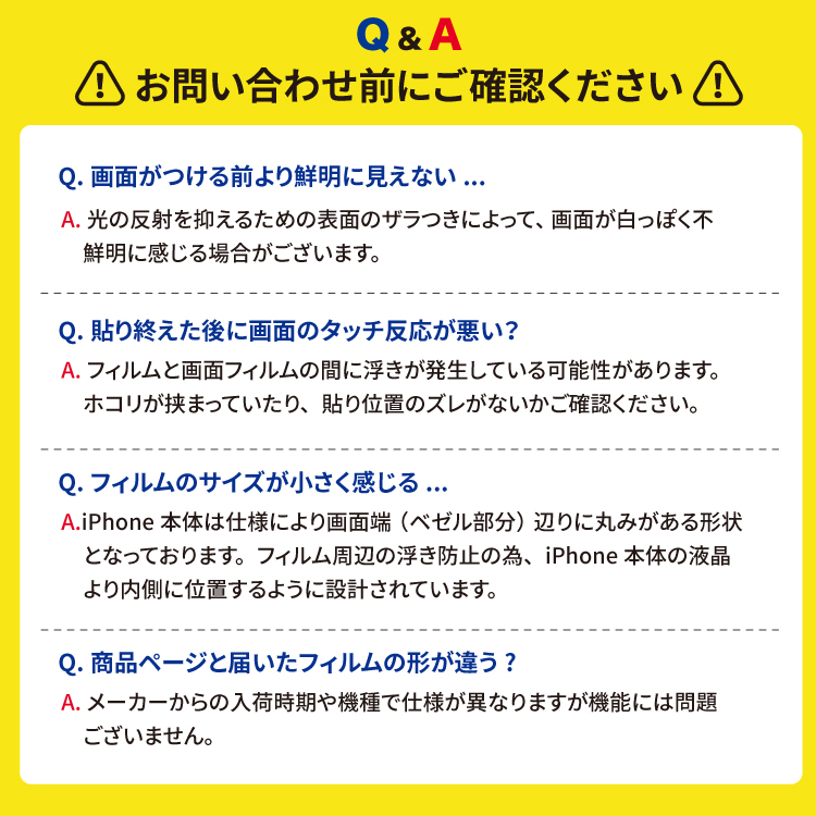 | 注意事項 | ※フィルムの形状は、機種及びメーカー仕入れ時期により商品画像と異なることがございます。 ※iPhone6/6s/7/8の機種は前面が黒色タイプのみの扱いになります。 ※フィルム保護範囲をご確認の上ご利用ください。 ※本体液晶の光量を調整の上ご利用ください。 ※画面の個人情報をのぞき見から完全に保護することを保証するものではありません。 ※発送は3〜4営業日ですが、繁忙期などで発送が遅れる場合がございます、ご了承ください。 |