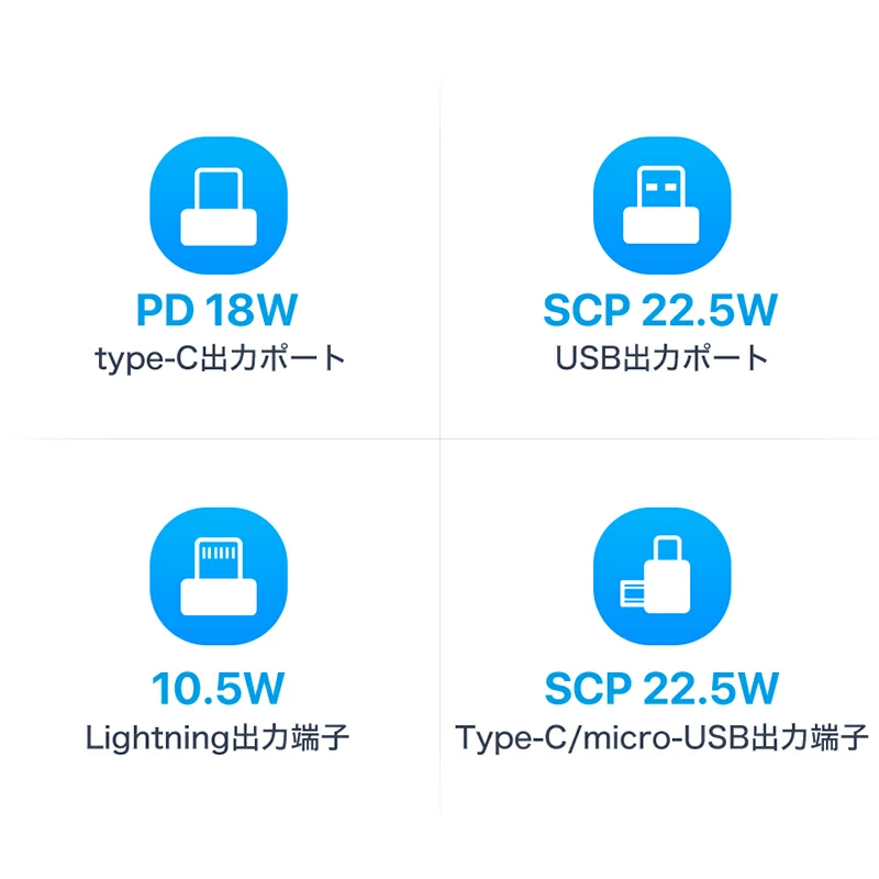 PD20W、QC3.0、SCP22.5Wに対応し、最大30Wの高出力急速充電が可能です。対応デバイスであれば、従来よりも短時間で効率よく充電できます。32cmケーブル内蔵で、持ち運びや使用も簡単です。