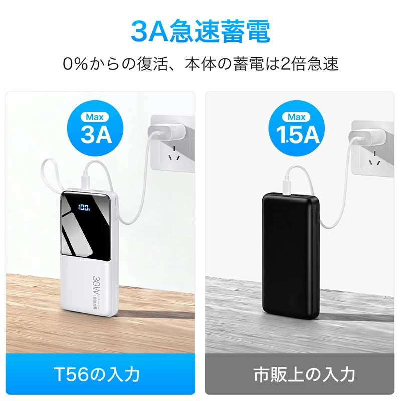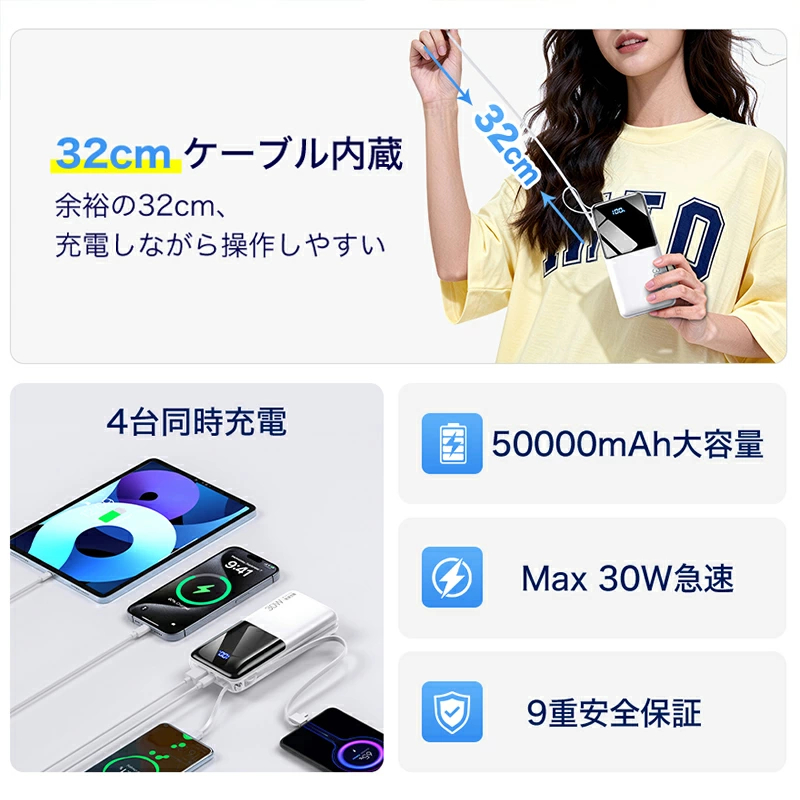 モバイルバッテリー 大容量 50000mAh 30W急速充電 バッテリー 4台同時充電 充電器 32cm超長ケーブル内蔵 LED表示 SCP 22.5W/PD 20W/QC 3.0最速 防災グッズ