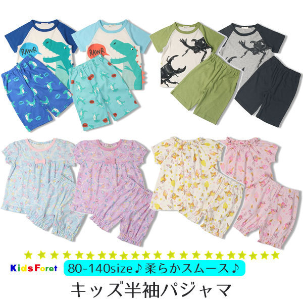 子供パジャマ キッズ夏 部屋着 寝巻 寝巻き 子供用 コットン100% セットアップ メンズ レディース 春 キッズフォーレ 夏 春 黒 ブラック 紺 青 ネイビー ベージュ ピンク ミントグリーン 柄 恐竜 昆虫 カブトムシ