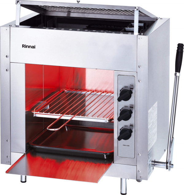 商品説明文:「赤外線バーナ」シュバンクバーナにより、食材を上火でこんがりむらなく焼き上げる。上火式で、焼け具合を見ながら使え、煙が気になりません。可動式で、焼物の種類により焼網の位置を容易にセットできます。2タイプ(焼面積違い)の機器より、食材の量、大きさに合わせて選択できます。圧電点火方式で、操作部が前面にあり、いつもラクラク点火。