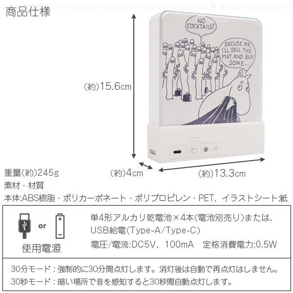 30分強制点灯と部屋が暗い時に音を感知して30秒間自動点灯する2つのモードで使えます。