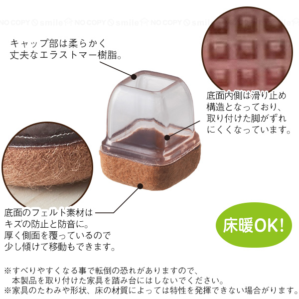 フェルト素材のクッションでキズ防止や防音に、キャップ部がしっかりフィットして取り付け簡単なソフト脚キャップ。