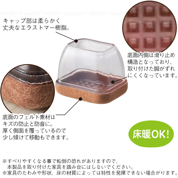 フェルト素材のクッションでキズ防止や防音に、キャップ部がしっかりフィットして取り付け簡単なソフト脚キャップ。