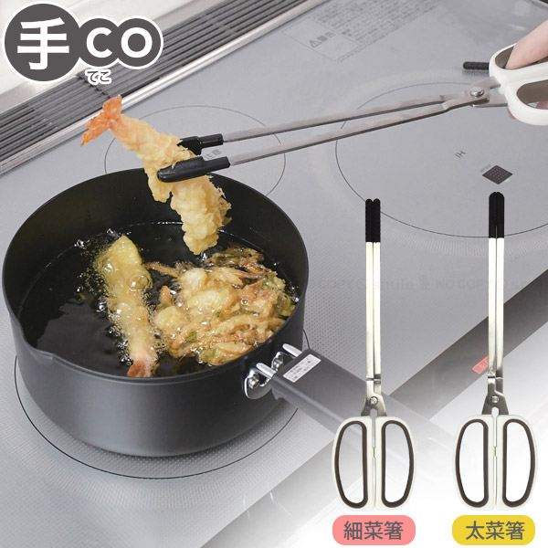 細菜箸 太菜箸 箸 ハサミ型 はさめる 使いやすい つかみやすい 掴む 握りやすい 調理 レトルトパック 出来立て食材 取り出す 揚げ物 指の力 軽い力でつかめる ビンの底 食洗機対応