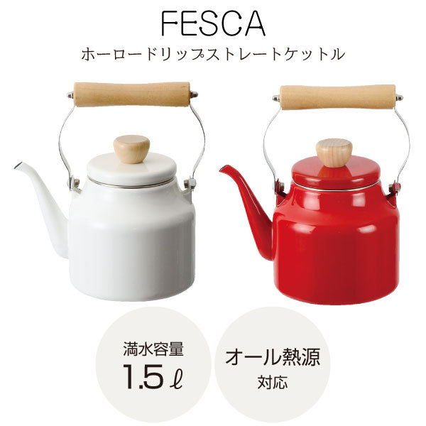 ガス IH 電磁調理器 ガスコンロ feska ホーロー ほうろう ドリップ ストレート ケットル ケトル やかん 湯沸し器 ポット シンプル ナチュラル かわいい 木目 木製 天然木 ハンドル コーヒー 珈琲 ホワイト 白 レッド 赤 HB-0923 HB-0924 509236 509243