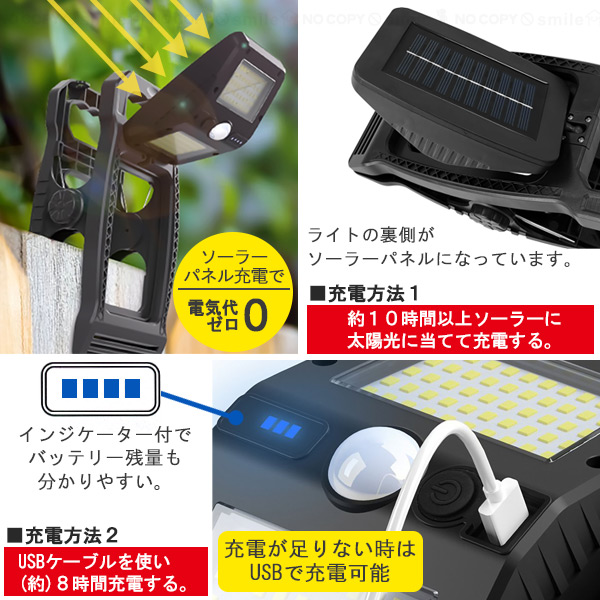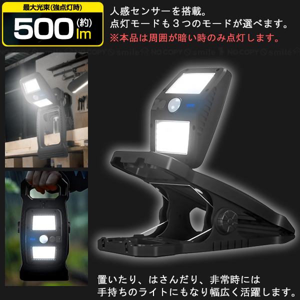 センサーライト LED 照明 屋外 屋内 クリップ 壁掛け 角度調節 360度可動 自動点灯 ソーラー充電 電源不要 500ルーメン 常夜灯 人感式 節電 エコ USB充電 非常灯 懐中電灯 災害 玄関 倉庫