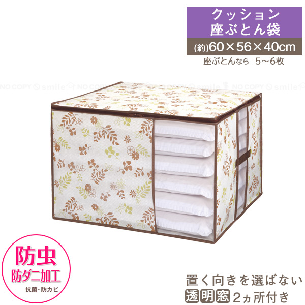 置く向きを選ばない透明窓2ヵ所付き、防虫・防ダニ加工座布団・クッション収納袋。