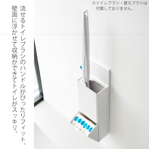流せるトイレブラシを壁面に浮かせてスリムに収納できる、替えブラシ収納付きブラシホルダー。