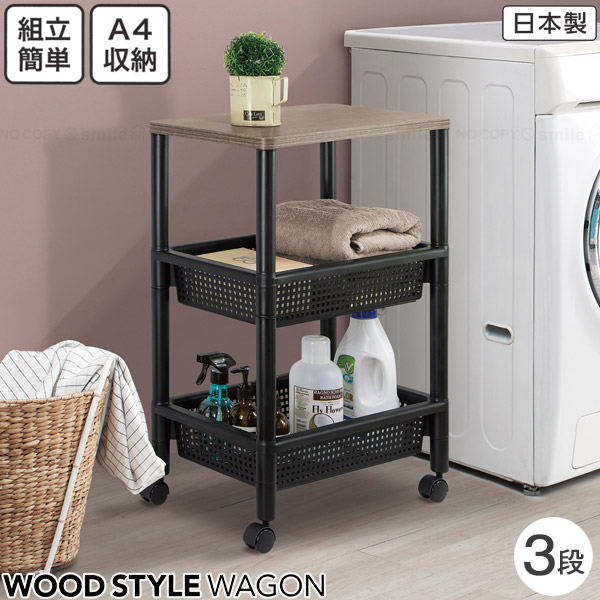 3段ラック ワゴン ラック バスケット 木製天板 キャスター付き A4収納 すき間収納 省スペース スリム 収納 整理整頓 ランドリー リビング キッチン ストッカー 工具不要 組立 木目調天板 簡単 日本製 おしゃれ ブラック F49001