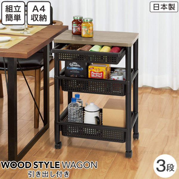 3段ラック ワゴン ラック バスケット 木製天板 キャスター付き A4収納 すき間収納 省スペース スリム 収納 整理整頓 ランドリー リビング キッチン ストッカー 工具不要 組立 木目調天板 簡単 日本製 おしゃれ ブラック F49104