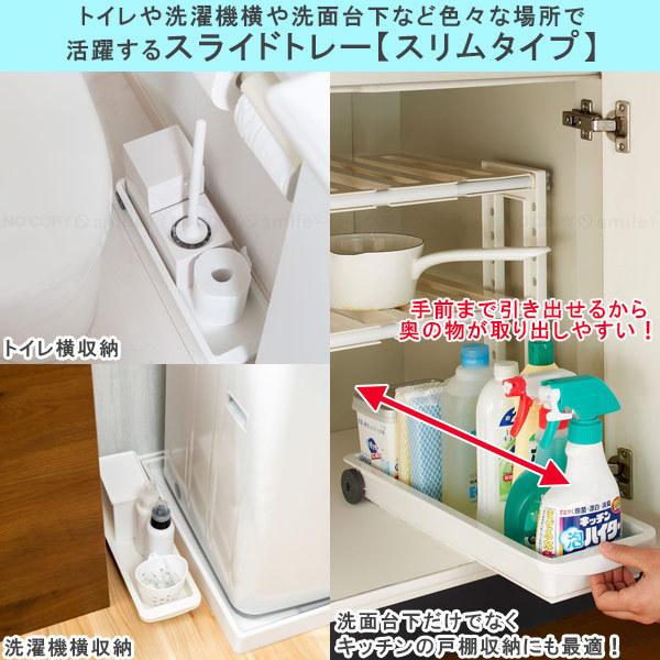 トイレや洗濯機横や洗面台下のスペースを奥まで有効に使えるスライドトレーのスリムタイプ。