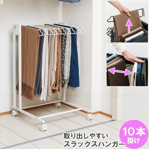 スラックス・ズボン・スカートはもちろん、ネクタイやマフラーも掛けて収納するのでシワが付きにくい。