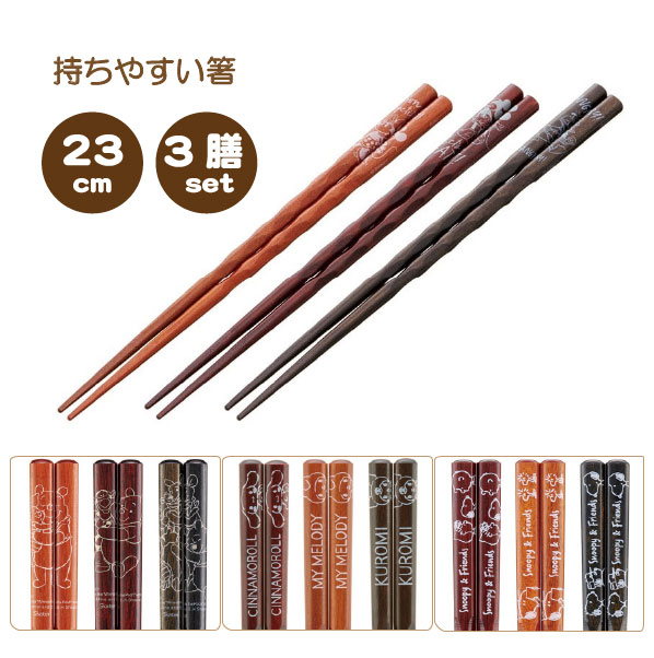 箸 木箸 天然木 塗り箸 3膳 3P すべり止め くぼみ 持ちやすい 23cm 3膳 かわいい おしゃれ ギフト プレゼント ミッキーマウス ミニーマウス ドナルドダック くまのプーさん サンリオ マイメロ クロミ シナモロール スヌーピー PEANUTS SNOOPY スケーター ANEN45T