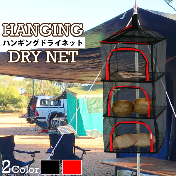| キャンプ場で大活躍!! 簡単に使える干しかご キャンプで大活躍するハンギングドライネット。 これさえあれば、食器の片づけがラクラク! 洗った食器をポンポン入れて、乾くのを待つだけ! 使い方もとってもカンタンなドライネット! 〈食器類の片付けをお手軽に〉 キャンプやバーベキューなどで使った調理器具や食器類などを洗ってぶら下げたネットの中に入れて乾くの待つだけ! 虫や焚火の灰・砂ぼこりなどが付着する心配もなく、衛生的に乾燥が可能です。 〈たっぷり置ける四段構造〉 合計4段の乾燥スペースがあり、食器や調理器具を別々に仕分けして乾燥させることができます。 各段ごとにファスナーで大きく開くので大きなものでも出し入れがしやすく、入れている際に他の段に入れた物を落としてしまうこともなく安心です。 〈吊り下げに便利なフック〉 好きな場所へサッと引っかけられるフック付き。 -耐荷重5kg- 〈通気性抜群!メッシュ素材〉 通気性を損なうことなく、小さな虫が入り込めない程度の絶妙な粗さのメッシュを使用。 全方向から風が通るので乾燥も早くより衛生的にご使用できます。 〈コンパクトに収納可能!〉 ドライネットを使わないときは折りたたんでコンパクトに収納が可能。 収納袋も付いているので収納すれば本体が汚れる心配もなく、簡単に持ち運びが可能です。 〈いろいろな用途で〉 キャンプやバーベキューで使った調理器具や食器類を乾燥させるだけではなく、干し野菜や梅干しの天日干し、魚の干物などを作るのにも使用できます。 | |