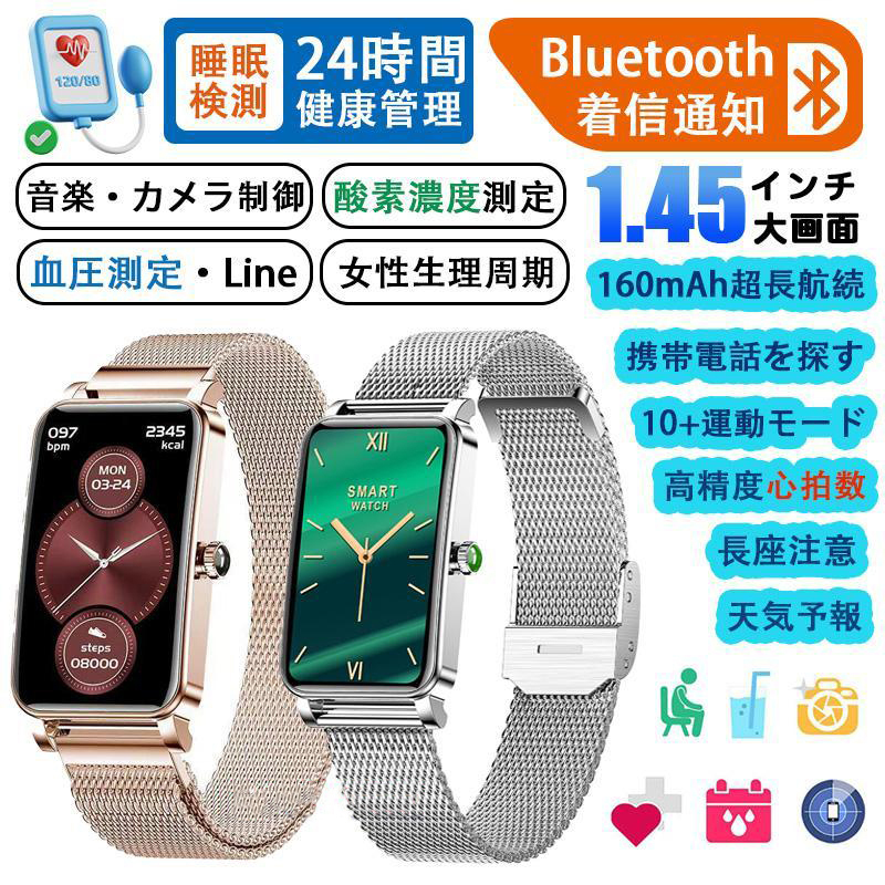 スマートウォッチ 日本製センサー 女性 血圧測定 心拍数 血中酸素 生理管理 歩数計 着信通知 睡眠監測 24時間健康管理 音楽再生 カメラ制御 長座注意 天気予報