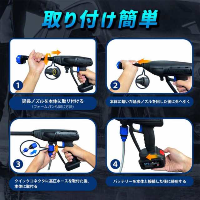 3.高圧洗浄機の取り扱う暖かいヒント:本体に延長ノズルを押し込みながら左右に回転して、本体の止め穴に嵌め合った後、先端のノズルを左回って噴射モードを選択して使用ください。