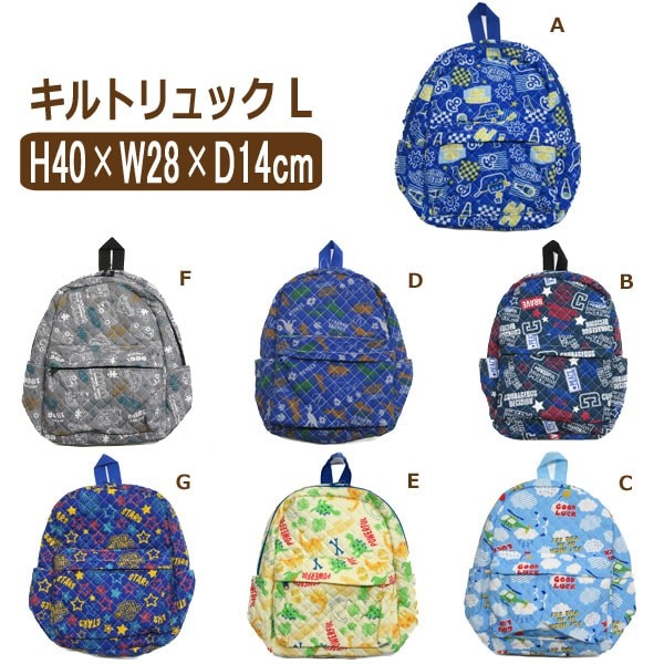 | b0378/男の子 総柄 キルト リュックサック L Aマリン/Bロゴ/Cスカイブルー/D恐竜ブルー E恐竜イエロー/Fクルマ/Gホシ | ||