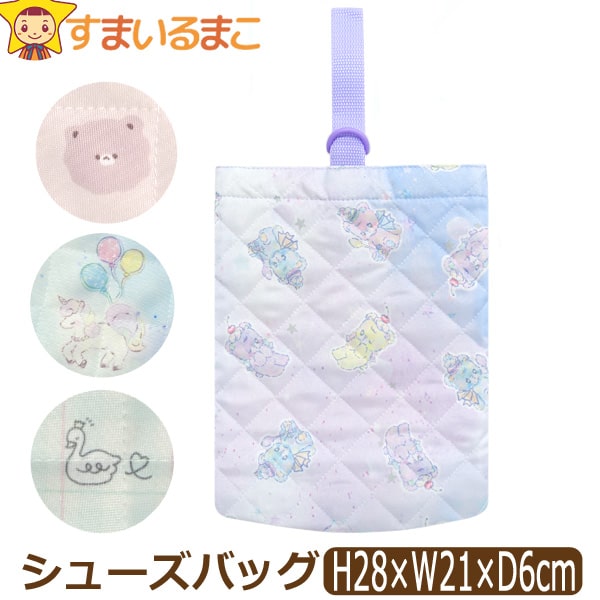 | 商品説明 | ※保育園・幼稚園や小学校で活躍するキルティング生地のシューズバッグ♪ ※持ち手をリングに通すだけの簡単な仕様です。 ※内側にはお名前を記入できるタグ付き。ポケットは付いていません。 ※表裏、同じ絵柄になります。 ※こちらの商品はキルトのステッチと縫製糸が商品によって若干違う色で出来上がっている場合がございます。予めご了承の上お買い求め下さい。 | |