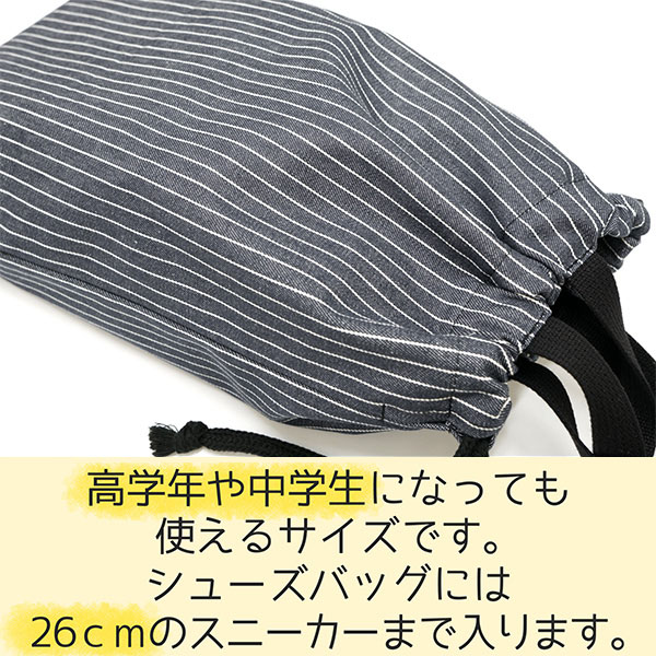 | 商品説明 | ※安心、安全な日本製はもちろん、裁断から縫製、検品、仕上げまで全て日本にて行っております。綿100%素材でお子様にも安心。 ※小学校・中学校で活躍するデニムのような丈夫な質感生地の、開口部が絞れる巾着タイプなので靴が飛び出す心配なしのシューズバッグ♪ ※高学年や中学生になっても使える大きめサイズです!26cmのスニーカーまで入ります。 ※紐を引っ張るだけの簡単仕様!持ち手付きなのでフックやポールハンガーなどに引っ掛けておく事ができて便利! ※内側にはお名前を記入できるタグ付き。 ※表裏、同じ絵柄になります。ポケットは付いていません。 | |