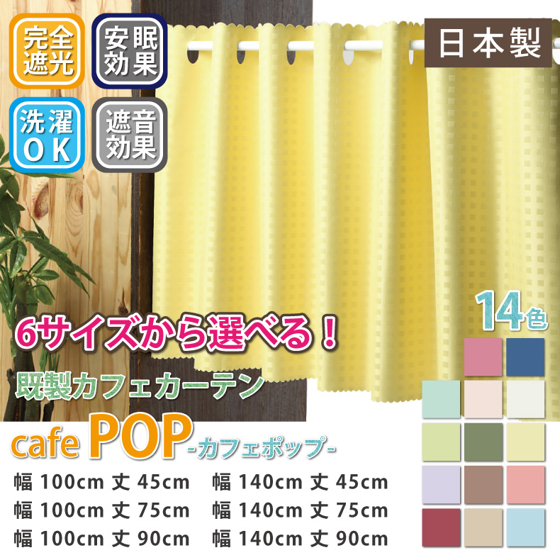 豊富なカラーから選べるカフェカーテン。手軽に窓に取り付けて遮光が出来るので、日差しが厳しい時や朝日がまぶしいところなどに、お手元にご用意いただいた突っ張り棒などで手軽に取り付けられます。完全遮光の生地で、裏面を樹脂でコーティングしてありますので、外からの光を完全にシャットアウトしてくれます。遮音性能もあり、楽器や飛行機などの高音域の音を遮る効果があります。(低音はあまりカットしません)カフェカーテンの上部は、丸くポコポコした飾りをつけており、カフェカーテンの下部にも、飾りを入れながら生地が特殊カットしてあるので、生地がほつれてくることはありません。