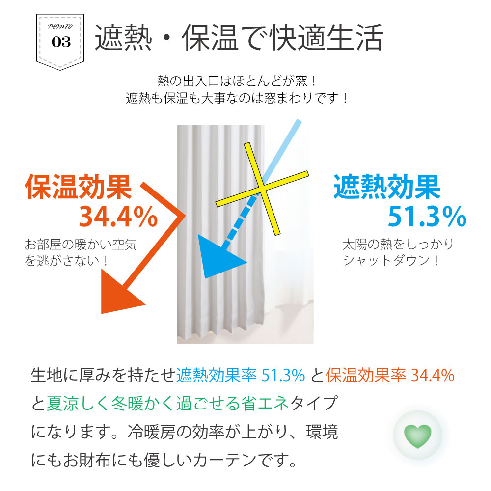 生地には厚さを持たせて遮熱効果率51.3%と保温効果率34.4%と夏涼しく冬暖かく過ごせる省エネタイプになります。