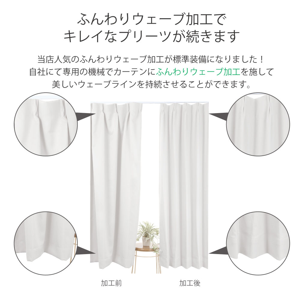 こちらのカーテンはウェーブ加工が標準装備となっております。カーテンのキレイなプリーツをご体感ください。