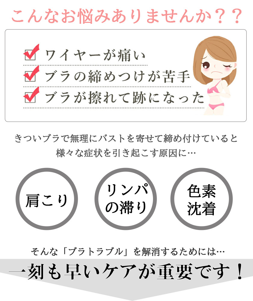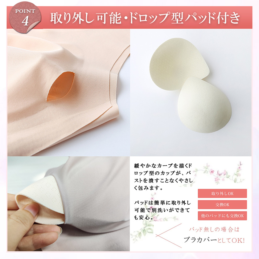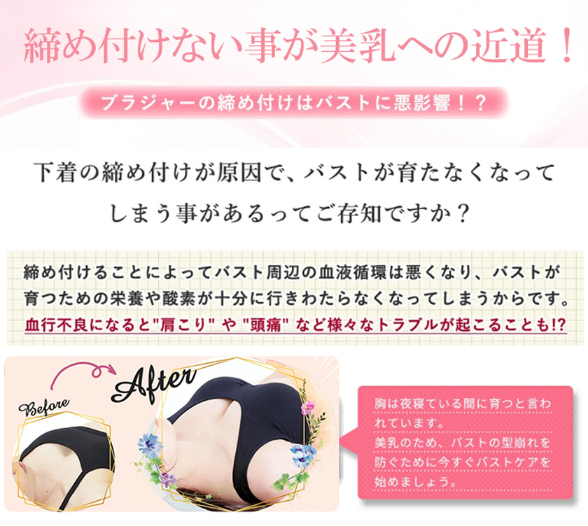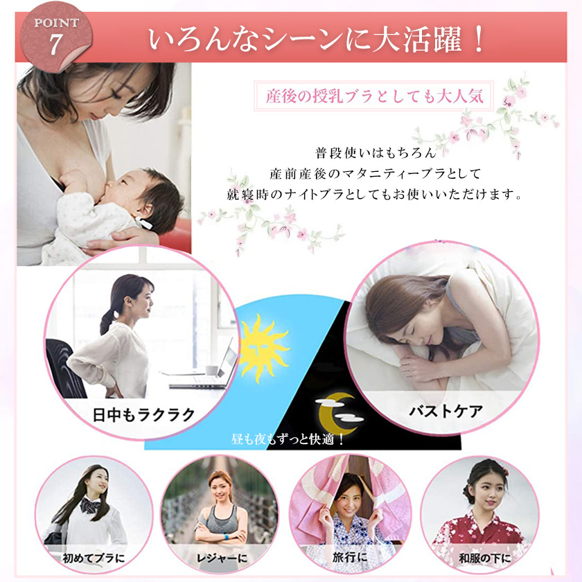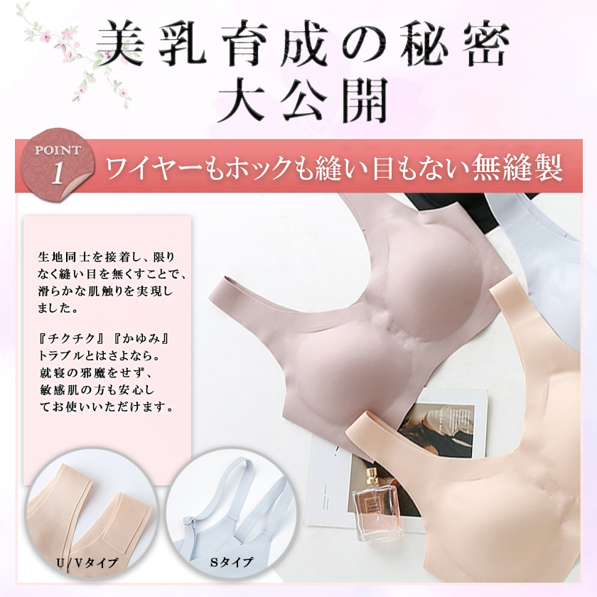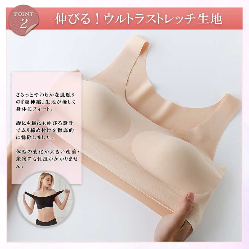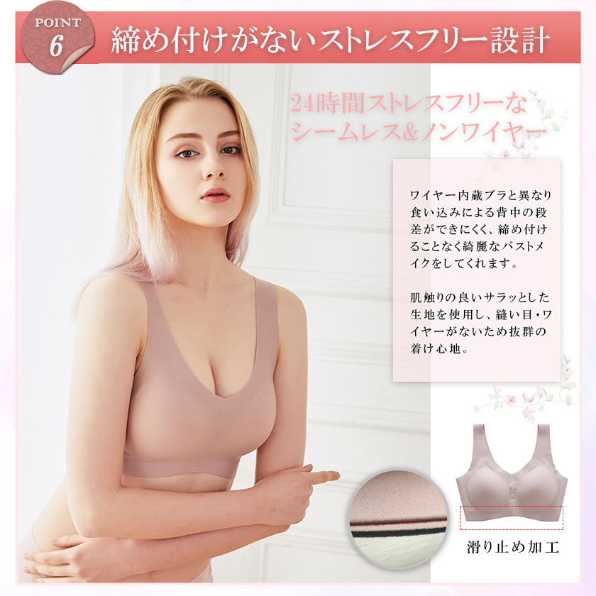 【ワイヤレスデザイン】縫い目なし、着用フィール感ゼロで、きつい感じもなさそう夜用ブラです。最先端の接着技術生地同士を接着し、限りなく縫い目を無くすことでなめらかな肌触りを実現しました。「チクチク」「かゆみ」トラブルとはなし、就寝の邪魔をせず、敏感肌の方も安心してお使いいただけます。背中の肉や脇の肉も流れる事無くしっかり収納でき、背中のラインもすっきり綺麗に見えます。