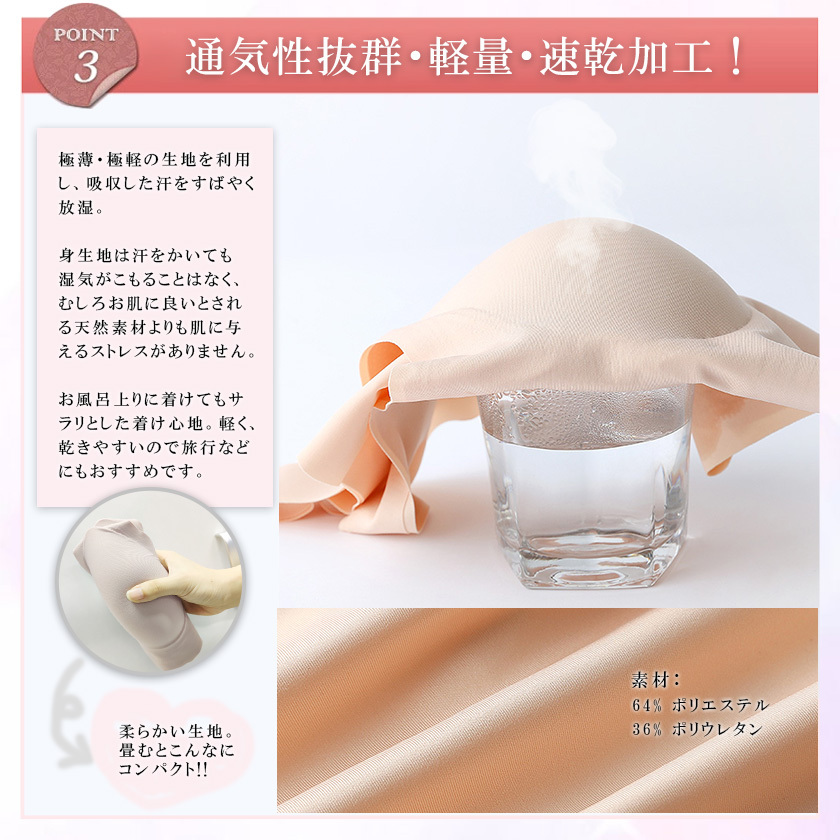 【通気性の高い素材】ポリエステル64%、スパンデックス36%。強ハリ性があるなめらかなポリエステルとスパンデックス繊維で作られて、速乾性や吸湿性が高く、通気性抜群のソフトパッドは柔らかな肌触り、快適な着用感を提供します。敏感肌にも優しいです。