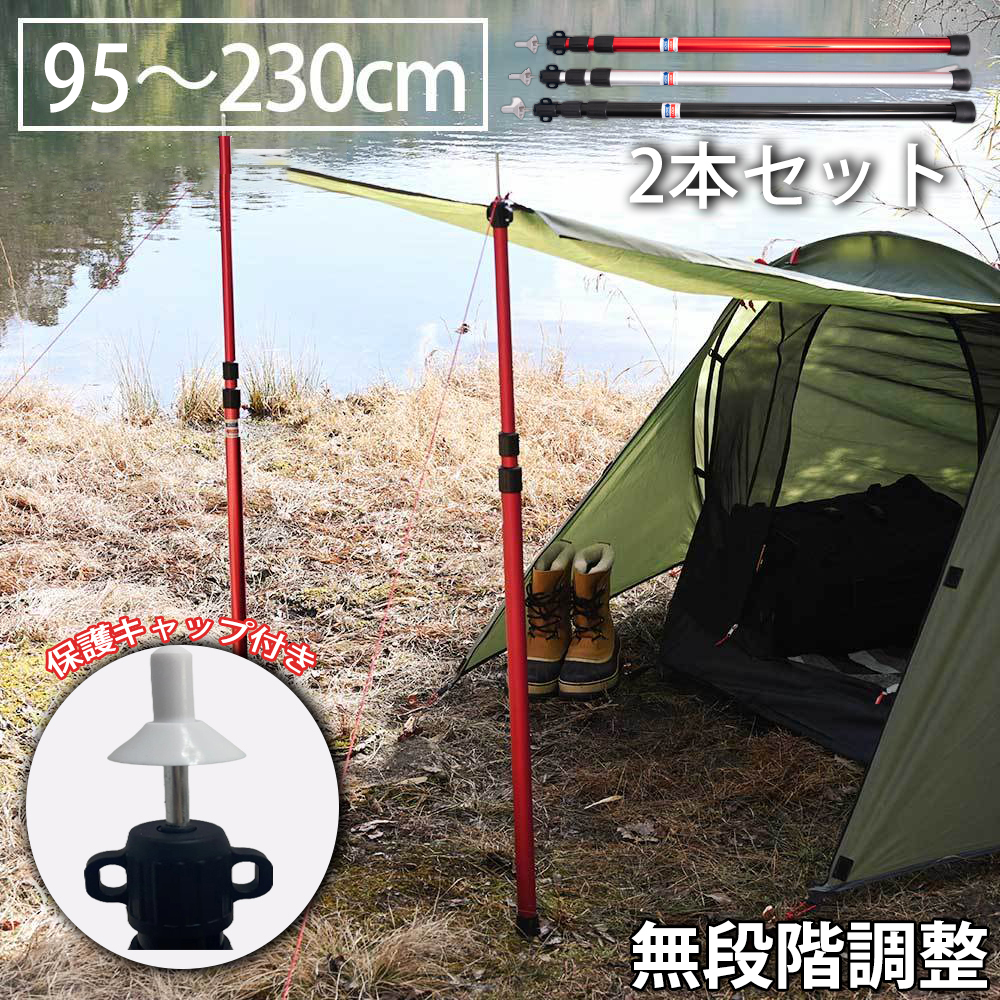 タープ部品 タープポール テントポール タープ用 無段階 2本セット アルミ製 直径28.6mm 高さ95〜230cm 組立不要 スライド伸縮式 キャップ付き 収納袋付き
