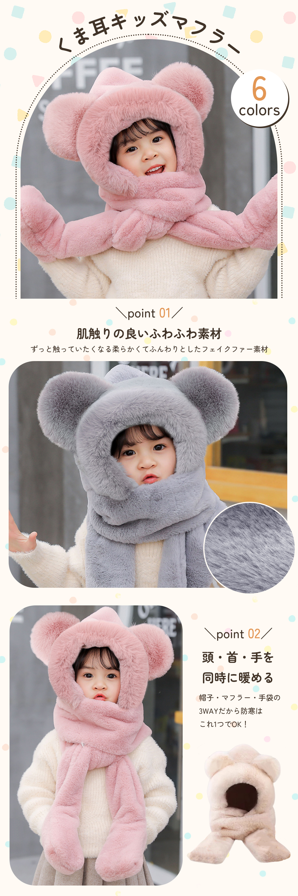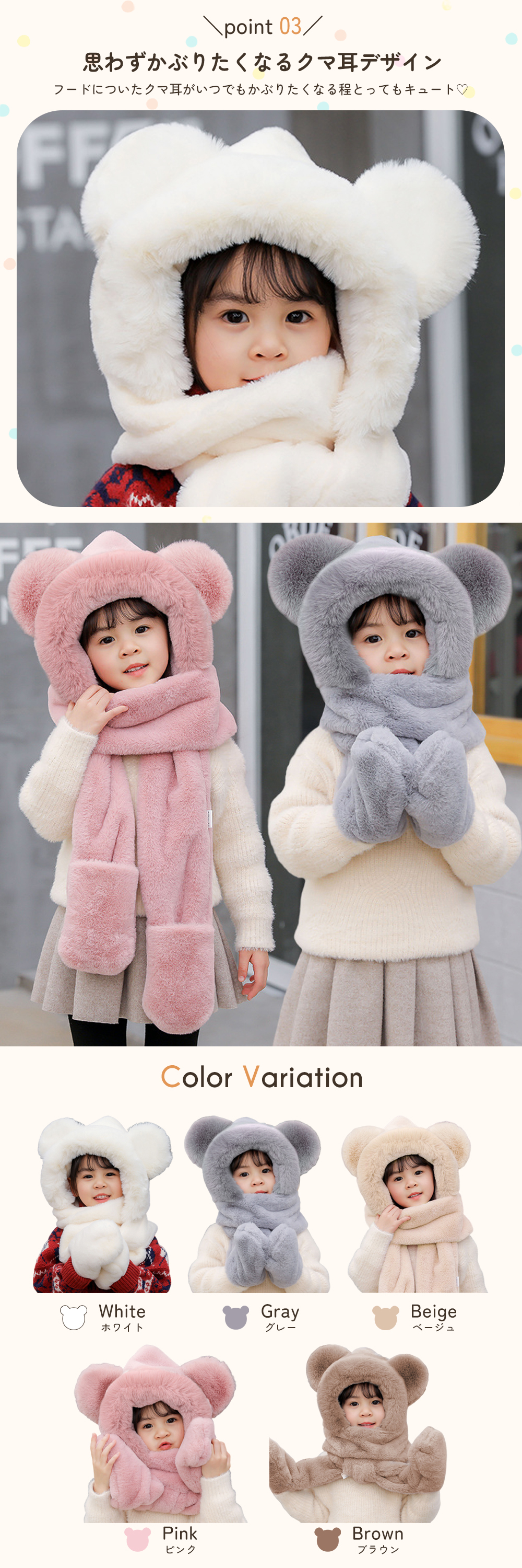キッズ マフラー 帽子 手袋 一体型 フード付き くま耳 防寒 フードウォーマー ベビー 子供 ふわふわ 暖かい 可愛い 男の子 女の子 幼稚園 小学生 通園 通学