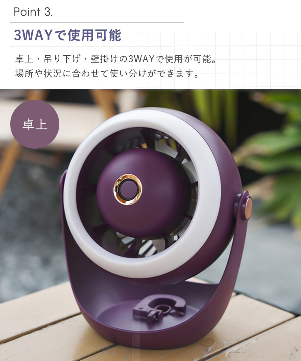 扇風機 卓上 壁掛け 吊り下げ 小型 USB充電 LEDライト付き 3段階 首振り アウトドア サーキュレーター パワフル送風 携帯扇風機 type-c コードレス